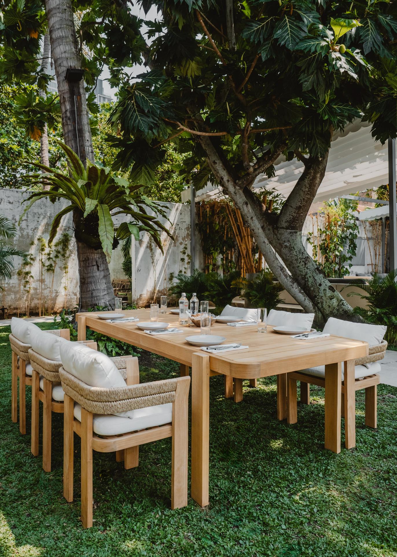 Sustainably sourced premium teak meets premium fabrics and neutral tones—a timeless blend of texture and durability.